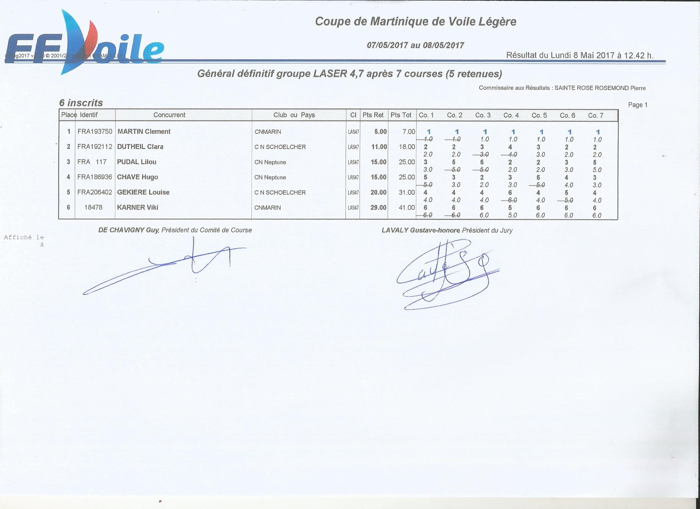 Malo Desrivières, premier de la catégorie laser4.7 conforte sa première place au classement général du championnat.Il devance Jimmy MARCHAND du CNN et Kylian BATON qui monte sur la troisième marche du podium. En catégorie Optimist minime, Martin clément 3ème et Aubert RAYNAL 2nd du CNMarin sont devancés par Chauvière Nuan du CNN. Dans la catégorie Optimist benjamin, Océane DESRIVIERE et Nicolas COPET, tous deux du Marin se classent aux deux premières places.