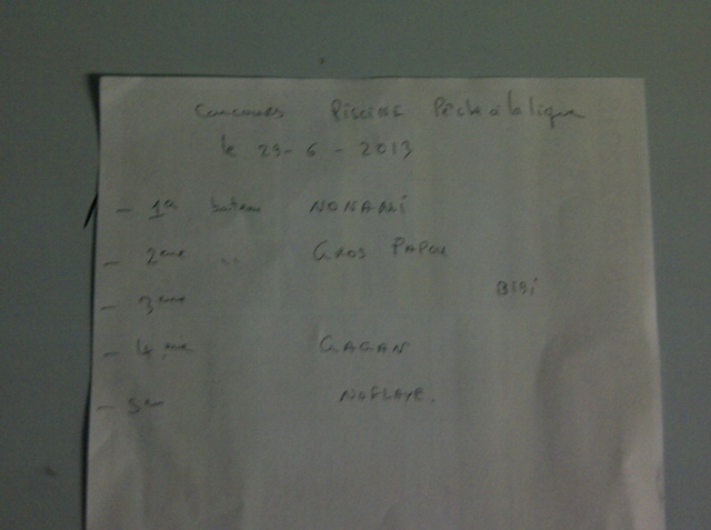 10 bateaux inscrits au concours de pêche à la ligne organisé par le Club. Les participants de cette édition 2013, au nombre de 25, ont du braver la pluie pour pratiquer leur sport favoris. Moins de prise que l'année dernière, a cause de la lune disent certains. Le vainqueur cette année, Miguel ne faisait pas partie des favoris et pourtant il est celui qui aura ramené le plus de poissons (entre 25 et 30 kilos).
