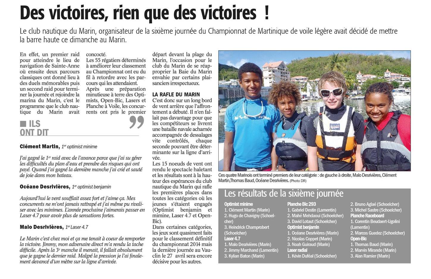 Le Club nautique Wind Force du robert a organisé le dimanche 9 février, dans la baie du Robert, la 5ème journée du championnat de Martinique de voile légère. Hormis la contre performance de Clément MARTIN qui termine tout de même à la 6ème place, l'équipe voile du Marin à atteint les objectifs fixés par les entraineurs Marion JACQUA pour les optimists et Open bic et; Albert LAPIQUONNE pour les Lasers.